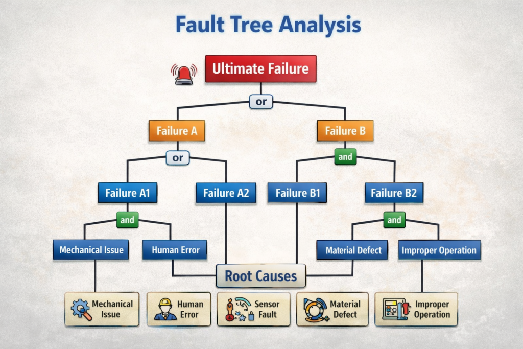 Similar to the fishbone diagram, the name of the fault tree analysis is derived from its structure. It is a deductive, logic-based method that models how multiple failures combine to produce a top-level event.