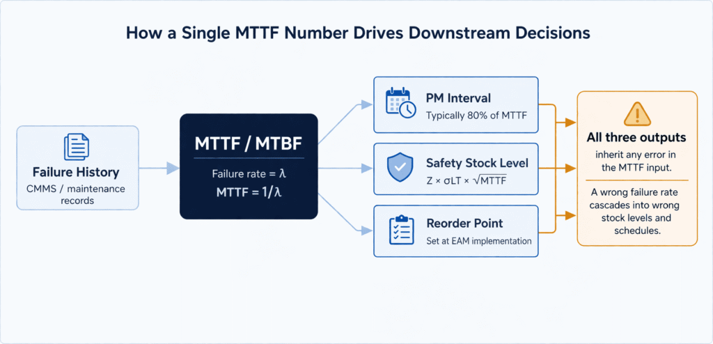 Crucially, if the MTTF input is wrong, because it was calculated from a heterogeneous population or under different operating conditions, every downstream inventory decision is wrong by the same margin.