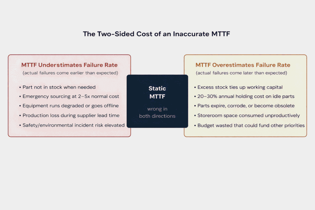 In MRO inventory management, an inaccurate MTTF creates the same two-sided problem that flawed FMEA criticality scores create: simultaneous overstocking and understocking, each costly in different ways.