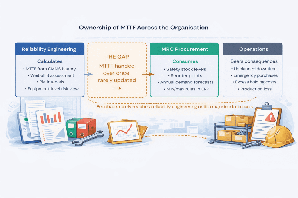 In most industrial organisations, the person who calculates the MTTF (reliability engineering) and the person who uses it to make inventory decisions (MRO procurement) work in separate systems, with separate KPIs, and with limited interaction. The failure rate estimate is passed across this gap once, at EAM implementation or during an annual review, and then used until something breaks badly enough to prompt a recalculation. That separation is where a significant proportion of both excess inventory and stockout risk originates.