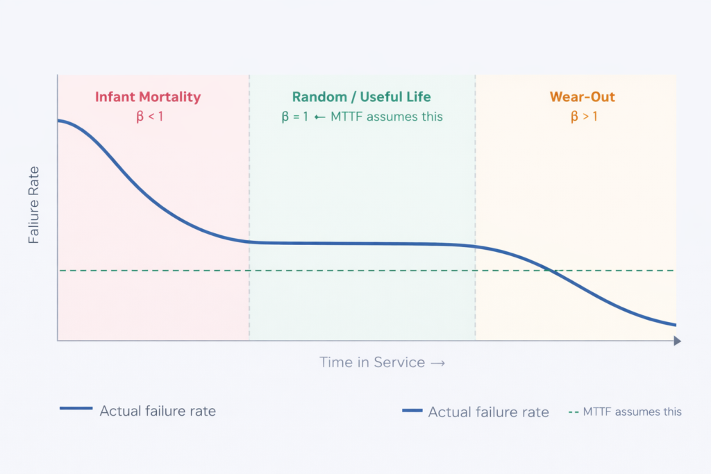 | β = 1 | Random / Useful Life | Failures occur at a constant, unpredictable rate. MTTF is a valid planning tool here. This is the only phase where the standard MTTF assumption is mathematically sound. |