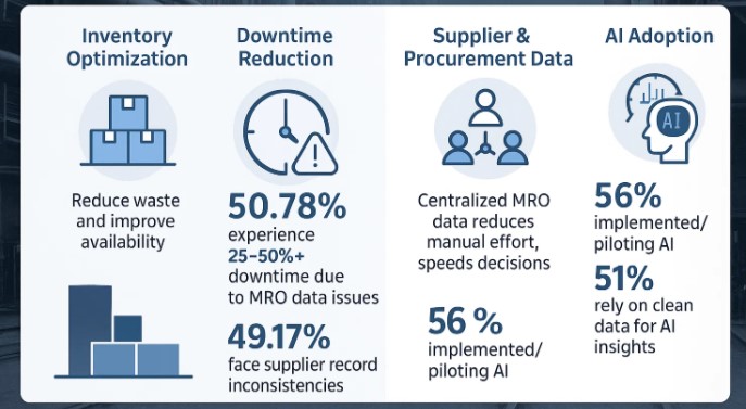 | Downtime Reduction | Lower unplanned downtime and higher asset availability | 50.78% affected by poor MRO data; predictive systems reduce downtime |